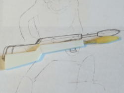 『レインボー戦隊ロビン』でもおなじみのレイガン。 ボグートのガンと同じく地下帝国の人達が使ってる武器のひとつ。形状から想像してライフルタイプの光線銃、レーザーライフルのようなものでしょうか?おそらく「黒い幽霊団」製です。 原寸の図面を描き、プラ板と真ちゅう棒とポリパテで制作中。 |