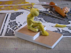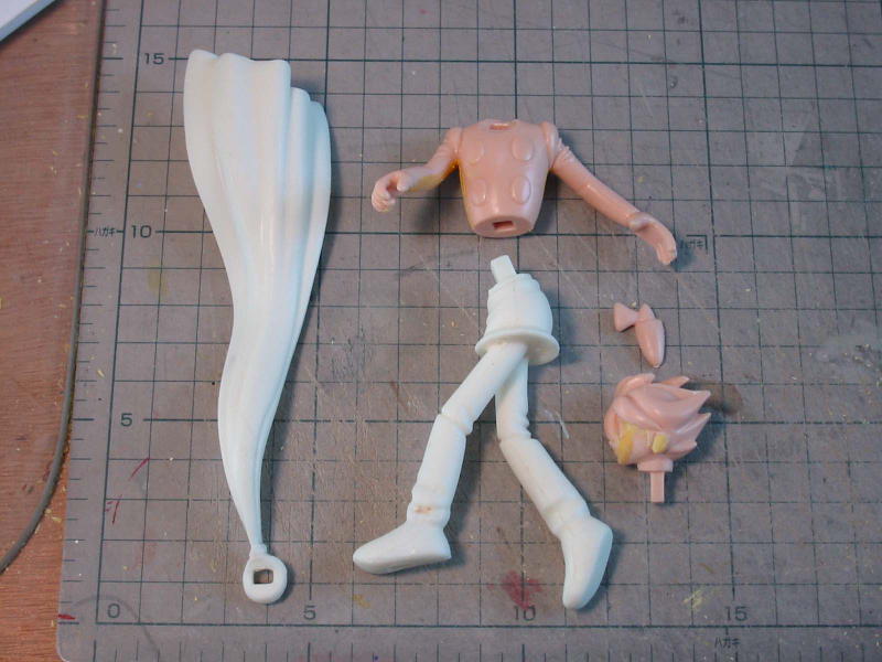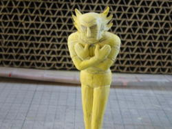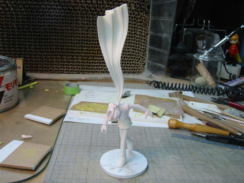 左足を手前に引き寄せ左腕の肘が当たるように調整。 イラストのデフォルメを生かしつつ立体に置き換えた時の矛盾を解消。納得いくまで切った貼ったを繰り返しますが、なかなか納得いかないですねー。 気分転換にスカートをはかせました。 |