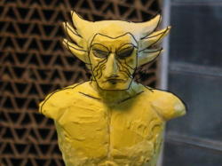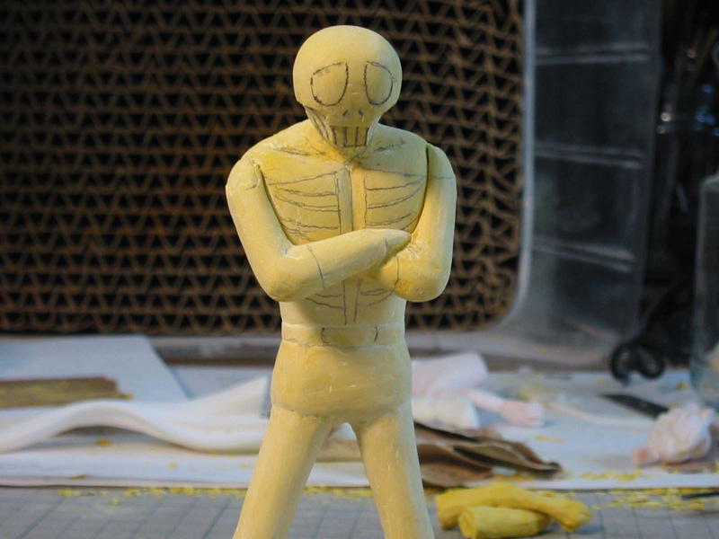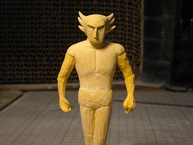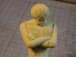 1/15シリーズを始めるときに描いてた各キャラのサイズ表を参照。ジョーと比べると頭ひとつ大きい。 パテを盛って、頭と体のバランスを決めます。 登場シーンはびっくりするほど少ないスカール。デザインも出るたびにちょっとずつ違う。誕生編の衣装はもっとホネホネっぽかった。 |