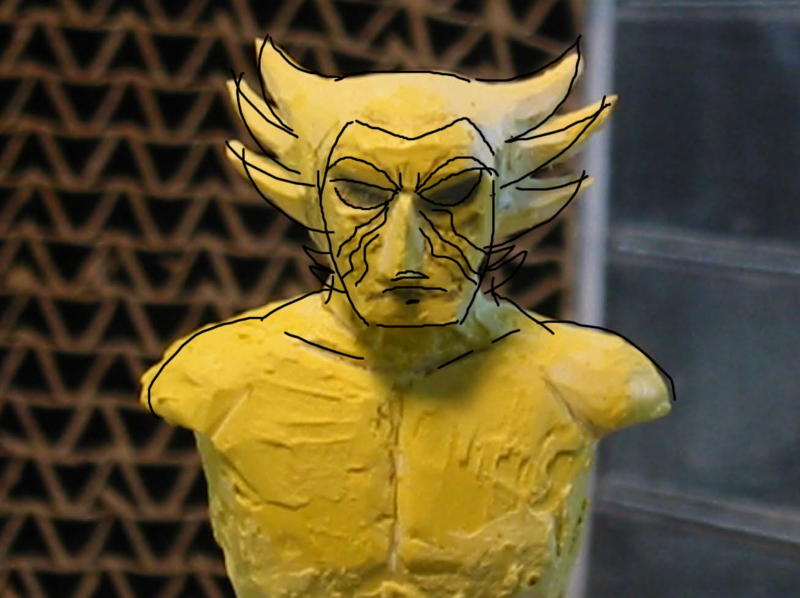 コミックの初登場シーンではジョーと身長が変わらないけど、スカールの下、ジェットより上ぐらいかなと、ラフスケッチを描きました。それをスケールにポリパテで制作開始。 頭部は原作ヨミ編の後半を参考に。 この髪型もすごい。 髪でしょ? 画像にペン描きで修正ラインを検討してます。 |