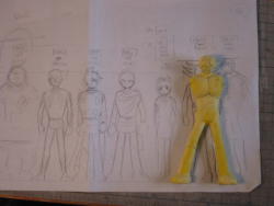 デザイン画を描く。お父さんがヒーロー体型になってしまったので原作をよく見て再検討。 犬は、動物は、むずかしい。 |