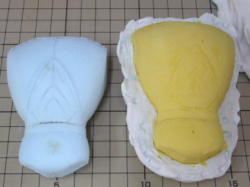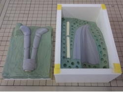 油粘土に原型を埋め、スチレンボードで箱を組み、、シリコンを流し入れる準備をしてます。 |