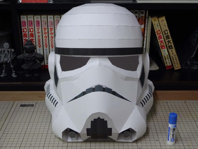 無料サイトからダウンロードしたデータをプリントして制作。今回は切り出したパーツの接着に細めのスティックのりを使いましたがとても作業しやすいです。コーヒータイムも忘れて作業は順調に進み、サイトに記載されていた制作時間を大幅にオーバーして堂々の完成!20年位前に買ったドンポスト製のヘルメットよりバランスがよく完成度が高いです。 インク代はほとんどかかってないので百均で買ったA4画用紙代の108円で被って遊べるストームトルーパーのヘルメットが出来ました。 |