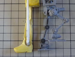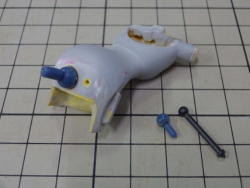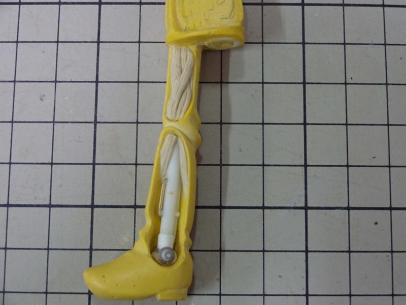 当時の商品版にはピアノ線を仕込んでいたのですがこれは試作品なのか入れてなかったようです。 他のパーツも気を付けて扱ったほうがよさそうですね。10数年前に抜いたレジンですから、だいぶ脆くなってます。 |
