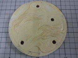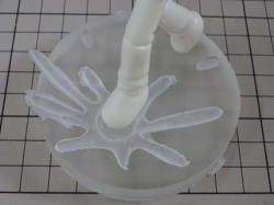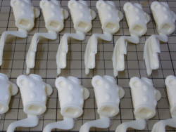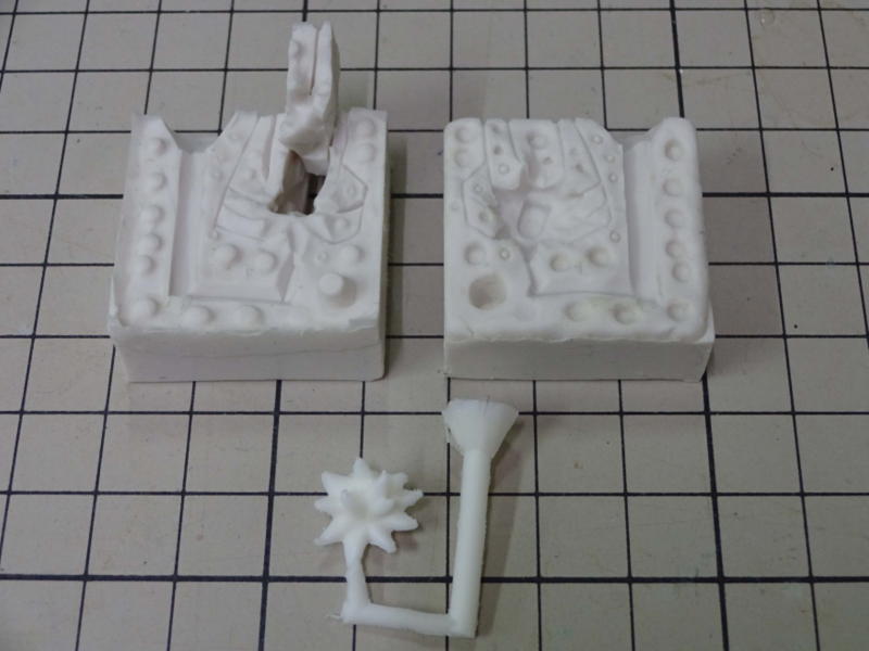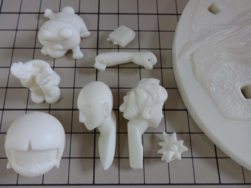 パーツの形状から、タイ焼き方式でいけると量産用のシリコン型を作って抜いたら、検品をパスしたのが30個中たったの5個だけ。 結局、新しいシリコン型を3つ割のアンダーゲート方式で作り直し。突起の数だけ開けた空気抜きのおかげで、ほどよくきれいに抜けてくれました。量産再開です。 |