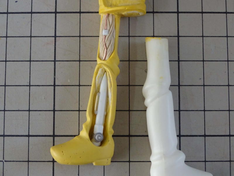 中華キャノンの足が使えそうかなと思いましたが、プラの3mm丸棒にプラ角棒、プラペーパー、 プラモのジャンクパーツ、真ちゅう線、 瞬着パテでスクラッチしました。 数種類描かれている009の解剖図によると、 人工骨はプラスチックとか特殊鋼管でできてるようです。 |