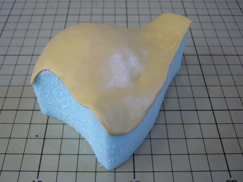 スタイロホームを削ってマントの起伏を作り、1o厚にのしたエポキシパテを被せて硬化待ち。 離型剤代わりのラップを間にはさむのを忘れてしまいましたが何とかなるでしょう。 |