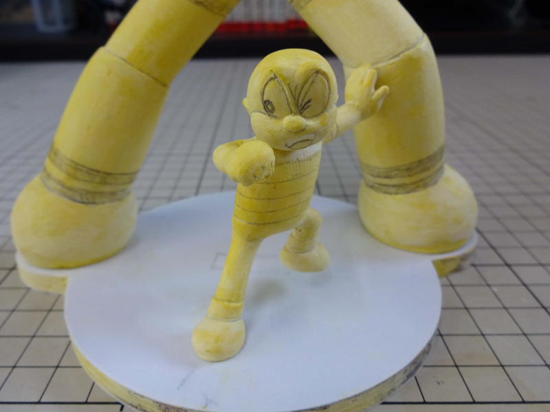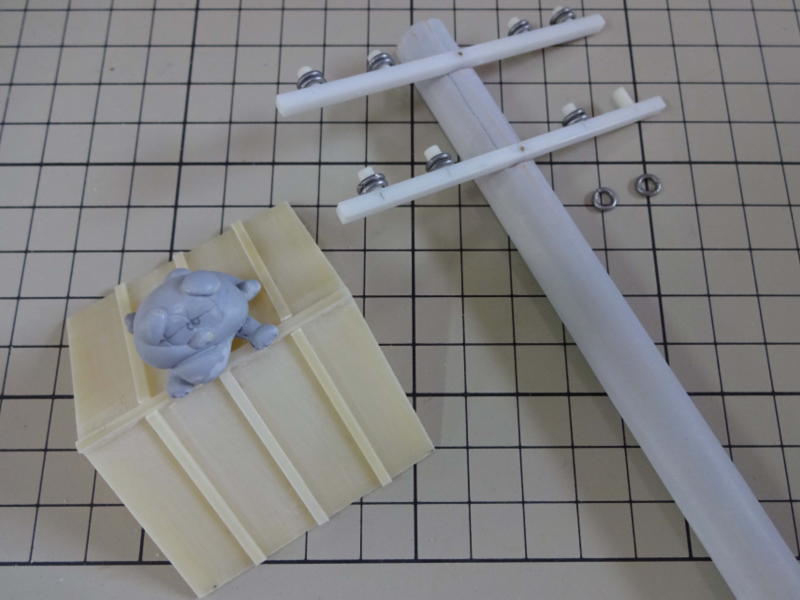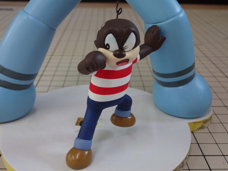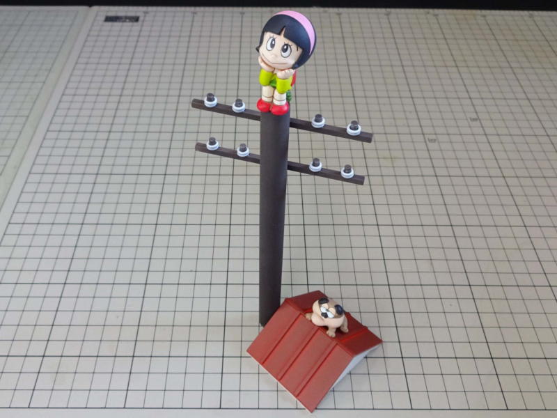 電柱を支える屋根を作ってブクを乗せました。 ブクは『佐武と市捕物控』と同じく『さるとびエッちゃん』シルバーバージョンで作ったやつをポーズを替えて再登場させました。 |
