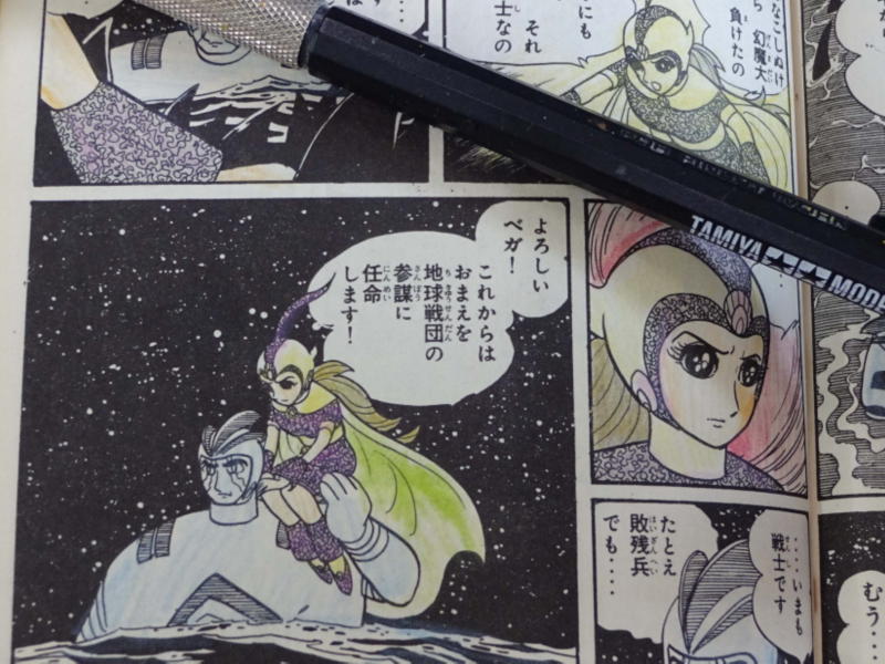 ベガの配色がわかるイラストは2枚だけ確認できました。1枚はサンデー・ コミックス第1巻の表紙ですが、よく見ると4人のコスチュームが作中と違っていたりベガの目の下にはヘルメットのシールドのような線が入っていたりします。今日初めて気付きました。 左手が寂しいベガの完成です。 |