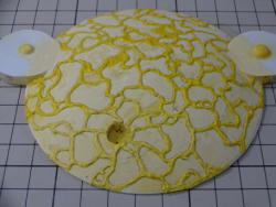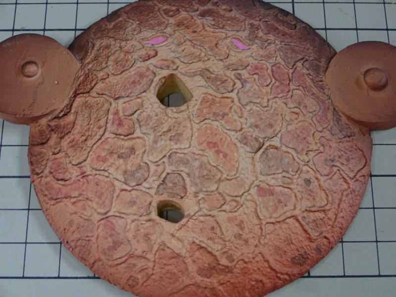 チビ幻魔サメディが球体に変化した姿の一部をベースにしました。ポリパテで球面を作り、同じくポリパテで模様を付けました。 |