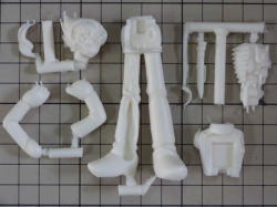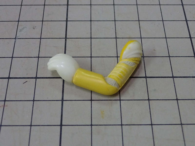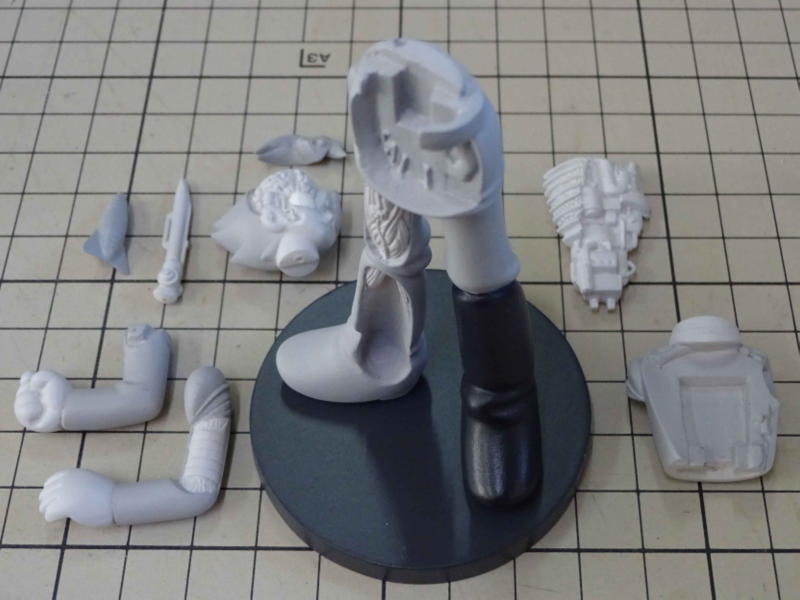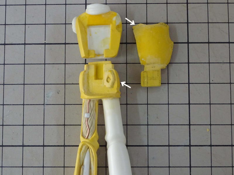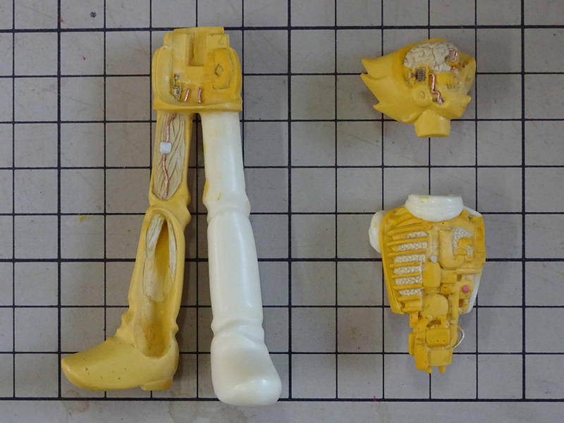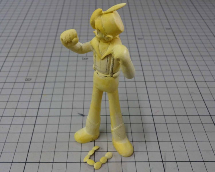腕とブーツは「おゆまる」で取った型を使ってダボ加工の位置決めをしたので「おゆまる」精度でピッタリ合わせることが出来ました。「おゆまる」はポリパテ造形のサポートとしてたいへん便利です。 現在パーツ数14、どんどんバラバラになっていきます。 |