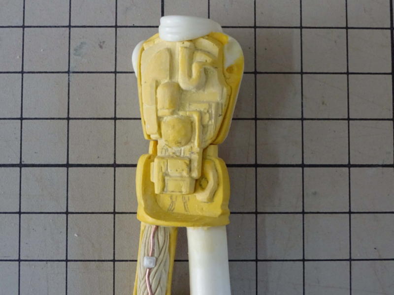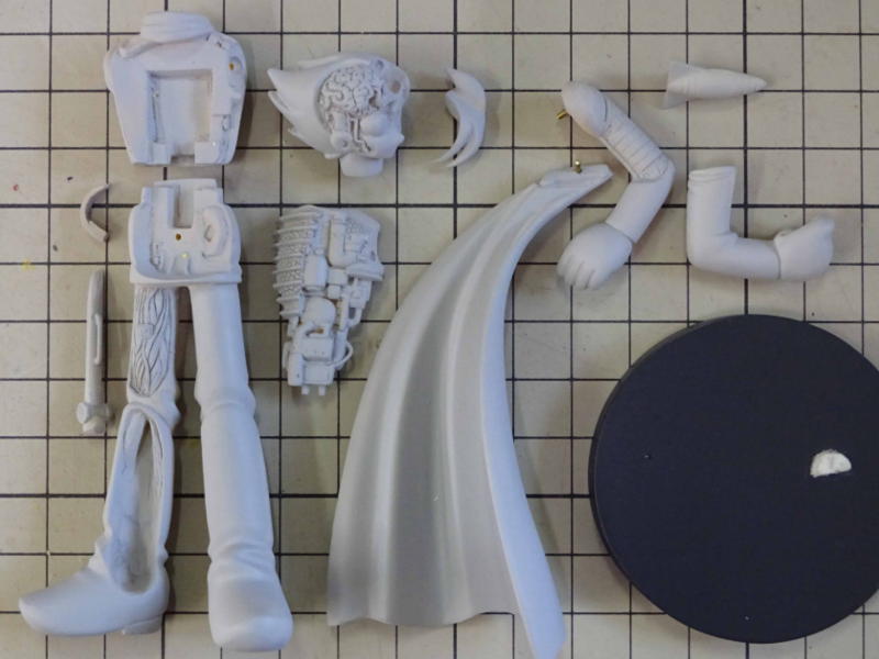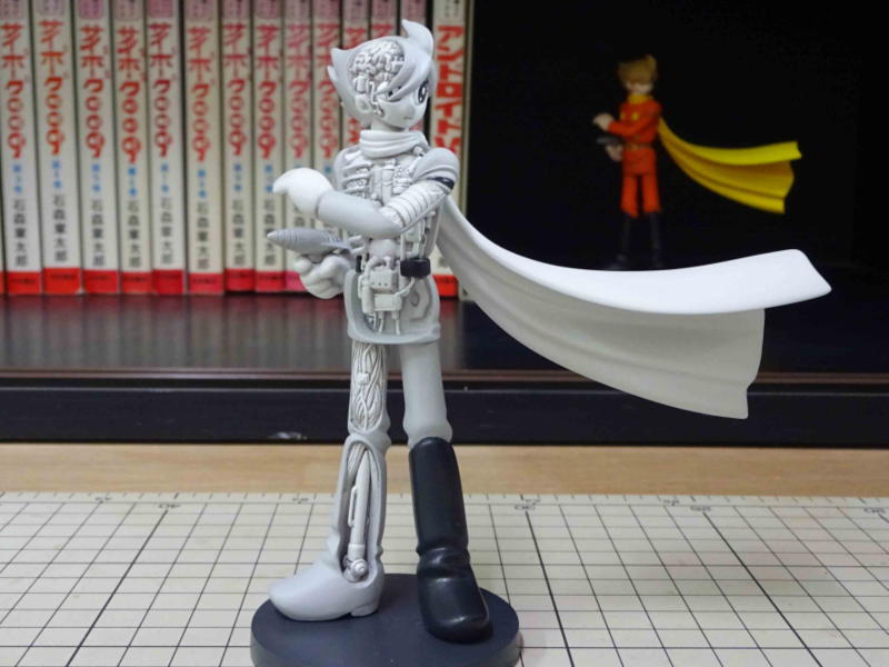 単品用に簡易な型を作って抜いたので気泡や欠けが多めです。ポリパテ等で整形しました。 マントは隠ぺい力が低い黄色で色を塗るので、照明などがあたってもパテ跡が透けて見えないように白色の瞬着パテで整形しました。 |