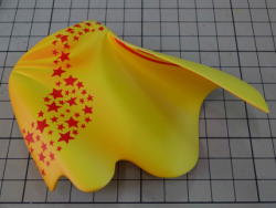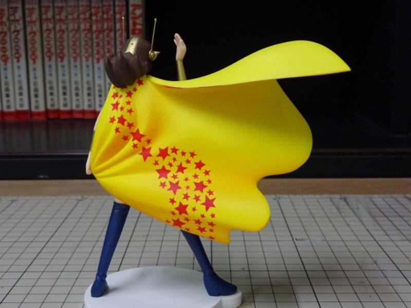 イラストの正面から除くマントの図柄の配置を考慮しつつ、実写版を参考にして塗り分けてます。 帯は波型にカットしたマスキングテープを貼って吹き付け塗装しました。 星は★型を切り抜いたマスキングテープを貼って、塗って、マスキングテープをはがして、を繰り返して仕上げました。 |