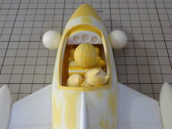 両腕の曲げ角度を調整して仕上げました。 操縦桿はつまようじです。上部の段差が押しボタンのモールドのようでとてもいい感じです。 レイガン2丁はお尻とシートの間に無理やり押し込みました。 |