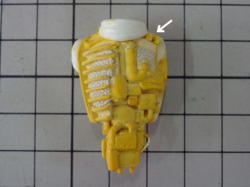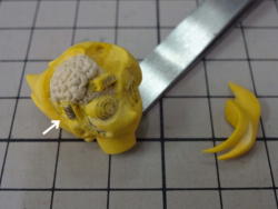 最後に奥歯の横に加速装置のスイッチを取り付け、造形作業終了。 解剖図の奥歯辺りをよく見ると、原始的な押しボタンのようなスイッチが描かれています。 |