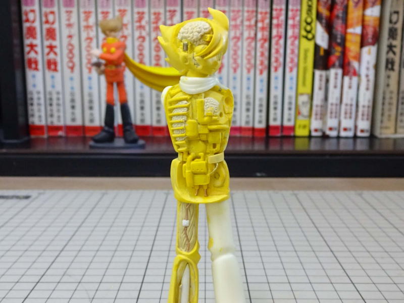 メカや臓器の位置とか分割を検討しようと彫っていたら、どこまで一体成型でデザインナイフ一本で彫れるものなのかと時間を忘れてガシガシ彫ってました。 |
