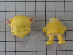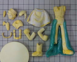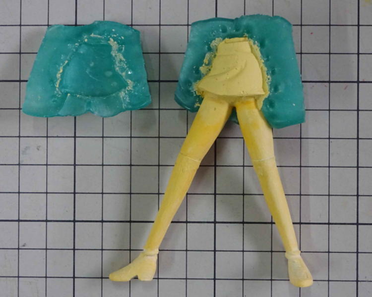 @「おゆまる」で、下半身をひざ上からスカートを丸ごと型取りします。 A型から外した下半身のスカートを削り落として離型剤を塗ります。 B型のスカートのモールドにポリパテを塗り、下半身を型で挟みます。 ポリパテが硬化し、布状のスカートが出来ました。 |