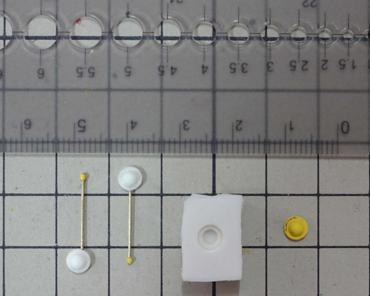 アイキャッチの画像では形状がよくわからないので、実写版を参考に想像で作ってます。 耳当てのような基部は、テンプレート円定規の凹を利用してポリパテ製の原型を作り、シリコンで型取り、レジンで複製しました。 アンテナ部は真ちゅう線を使い、先端をポリパテで成形して瞬着でコーティングしました。 |
