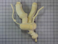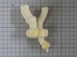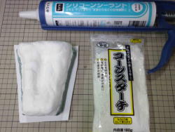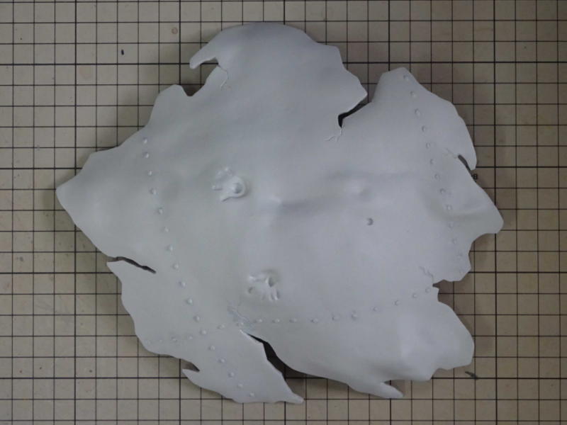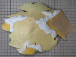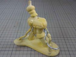 目地埋め等に使うシリコンシーラントとコーンスターチを練り合わせたものを原型に押し当てて型取りしてます。 ベンケイの様に、大きく単純な形で二次原型のための型取りには適した型取り方法です。 良い点は材料費が安いことと、やわらかいおもち状で垂れないので枠組みが必要ないこと。難点は妙な匂いがあるのと練り合わせるのが面倒なことです。硬化時間は3時間〜5時間くらいです。 型取り性能は通常のシリコンとおゆまるの中間くらいでしょうか。 |