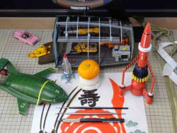 発泡スチロールで作った半球体の上に、石粉粘土製の宇宙船の外装を乗せて自然乾燥中。 外装で直径200o以上あるので、内部のメカを作ったらそこそこ大きなサイズになりそうです。 |