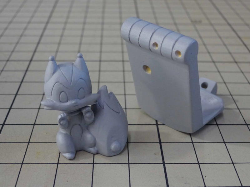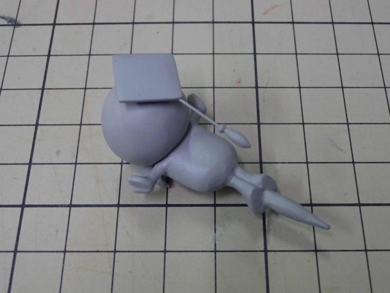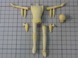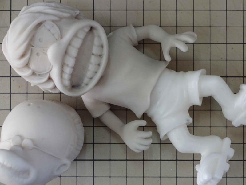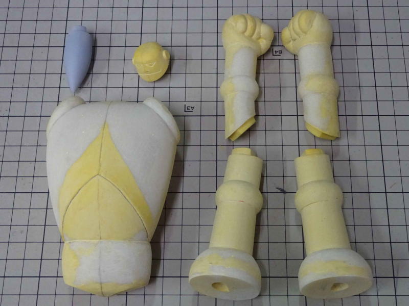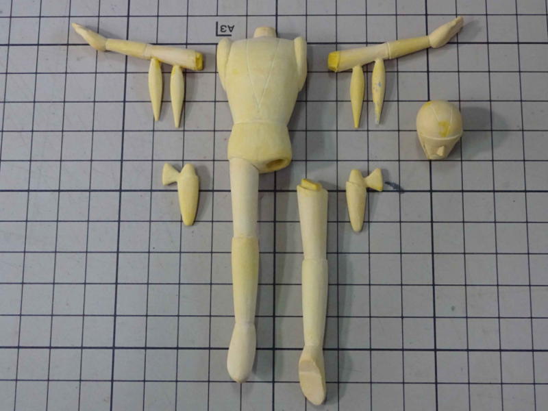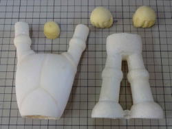 シェルキャストは型にハケ塗りして成形するウレタン樹脂です。 中空になるので軽くしたいものを作るときに使ってますが、厚みを均一にするのが難しく、いまだにうまく扱えません。 頭と拳はポリパテに置き換えました。ポリパテはシリコンシーラント+コーンスターチ型と相性が良くないので「おゆまる型」で抜いてます。 在庫処分の各材料で置き換え完了。 |