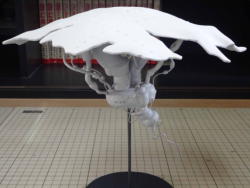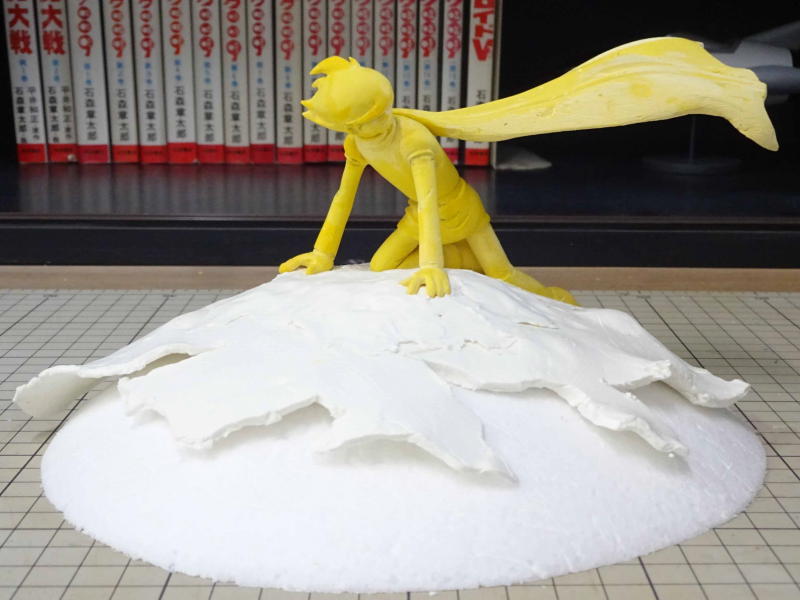 石粉粘土製の宇宙船がすごい勢いで縮んでますが、裾がめくれ上がっているところなんかはいい感じです。 このまま完全硬化を待ちます。 |