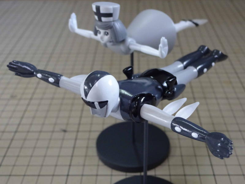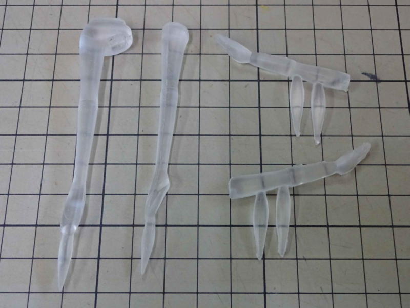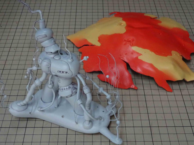 噴射炎のエフェクトと一体化させたリリの両脚とウルフの両腕をクリアレジンに置き換えました。 レジンは平泉洋行のハイキャストクリアを使用。扱いやすく透明度も良好です。脱泡機を使わず手流しなので気泡は入りますが、噴射炎なので気になりませんし、塗装後すりガラス状に仕上げます。 |