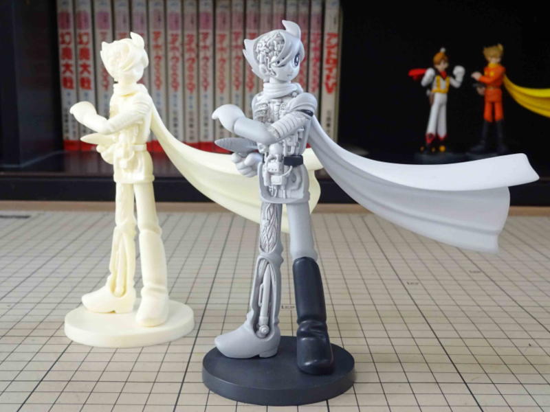 口絵を拡大コピーして実寸サイズの資料を作成。モノクロだと真っ黒になったのでカラーでコピーを取りました。拡大率200%でちょうど1/15スケールサイズです。 前に作った『太古の夜』と『霧の時間』 のシリコン型を使ってポリパテで複製して素体としました。 |