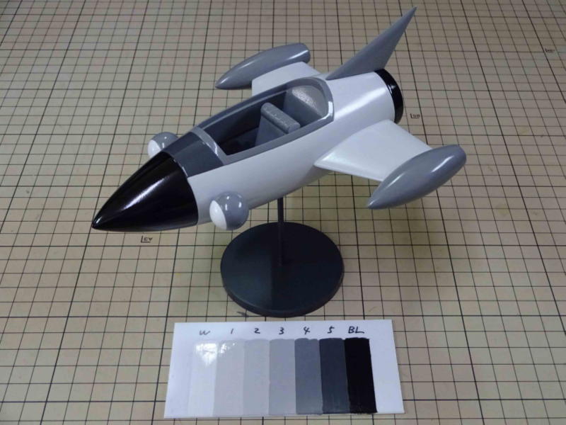 色はモノクロ版009や、はっぴーベルさんのロビンたちを塗るときに作ったカラーチャートで色合わせしました。 調色はホワイトとブラックを用意し、最初に真ん中の3のグレーから作り始めると他の色を出しやすいです。 |