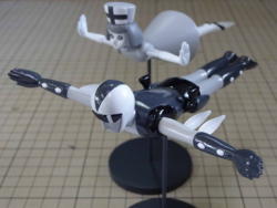 頭に耳のような突起を付けました。 胸を角張った鳩胸にしました。 脚は開き角度を小さく調整。 噴射炎エフェクトパーツは左右共通パーツとして仕上げてます。 |