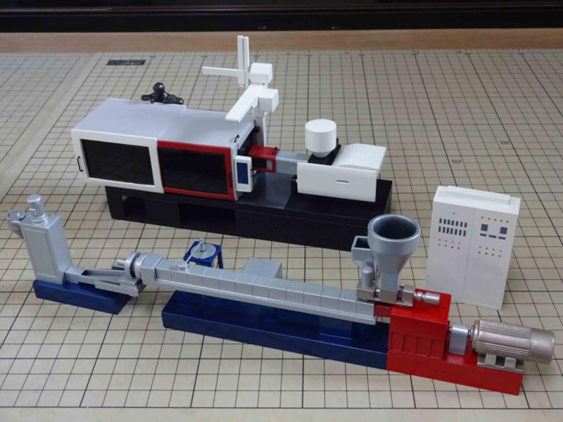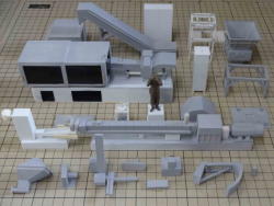 手前が押出成形機。ひき肉機のようなものです。 機械と備品が全て出来たので、制作済みの建物にセットして工場模型の完成です。 |