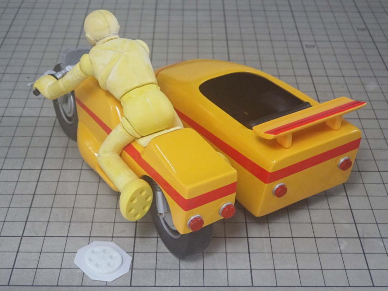 キカイダーがサイドマシンに上手に乗ってくれるように、関節を数度調整。 キカイダー&サイドマシン「バババ・・・ヴー・・・ダダダダダ」と完成しました! |