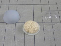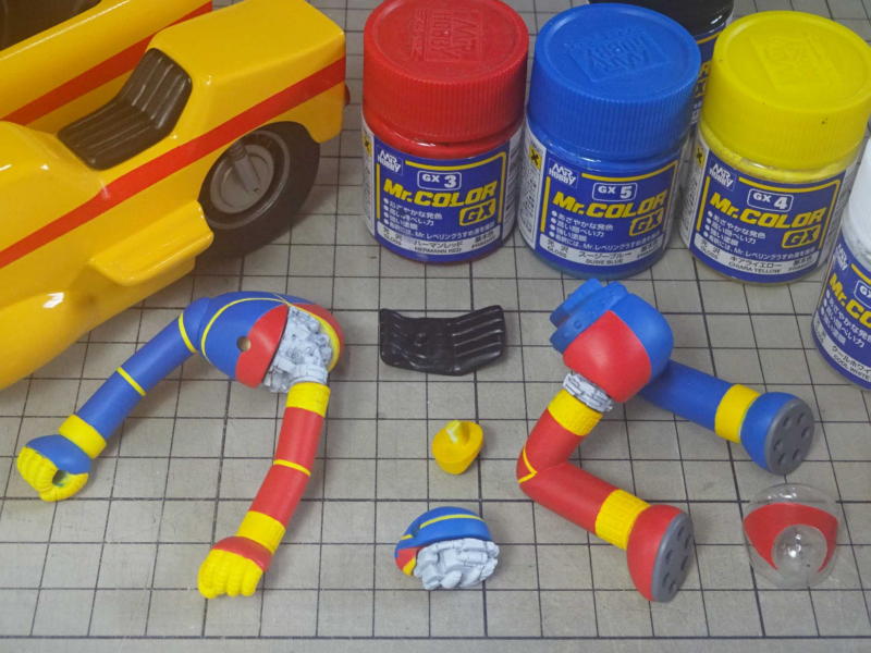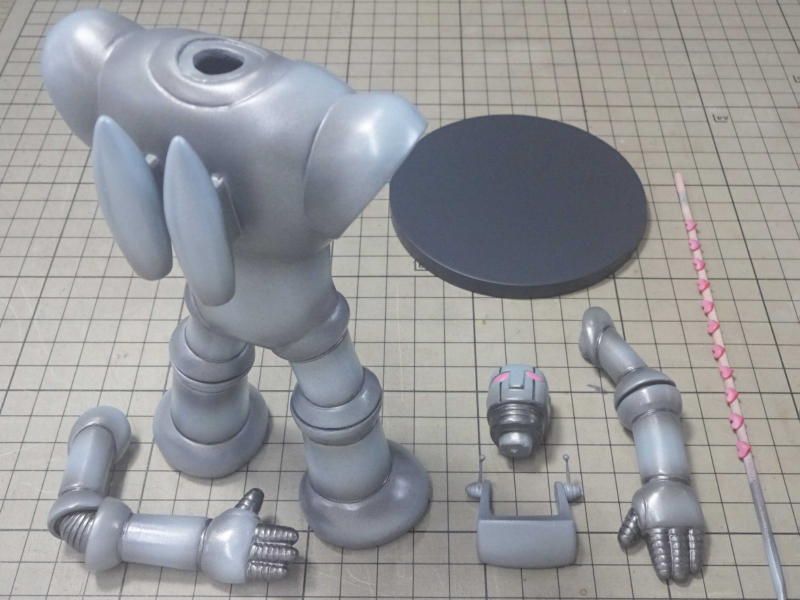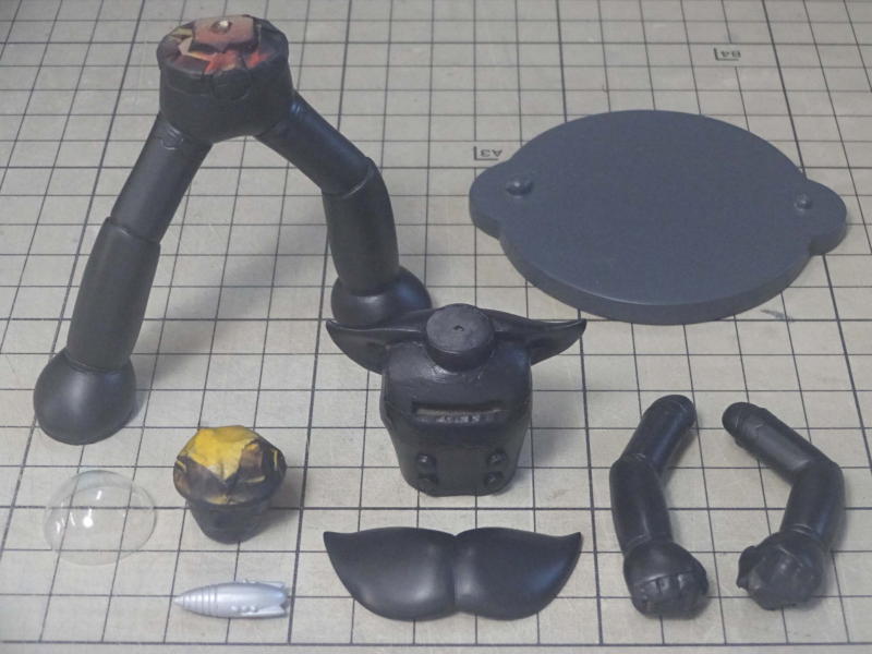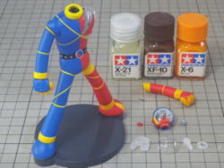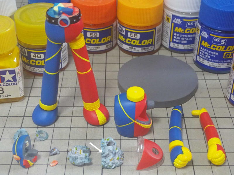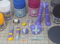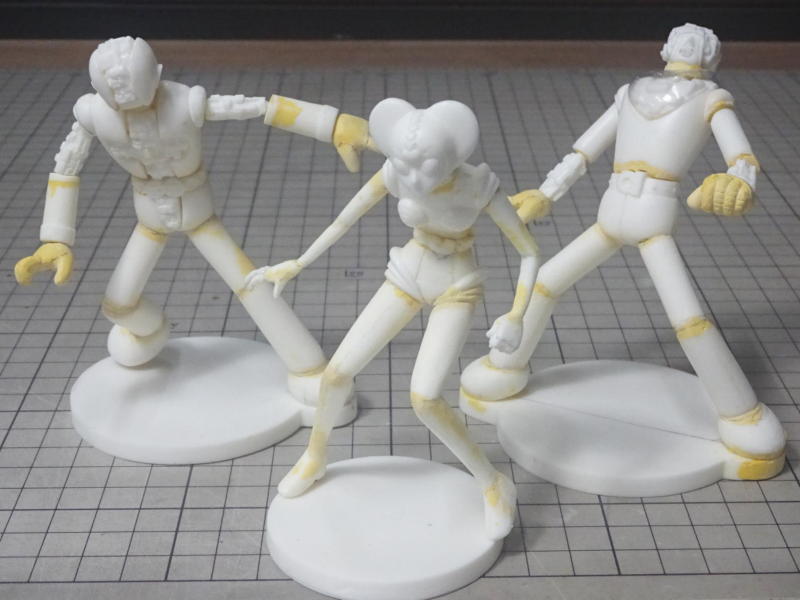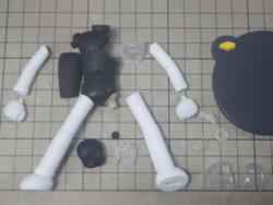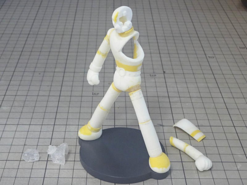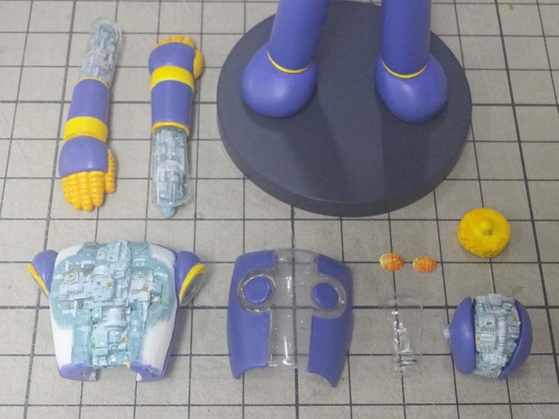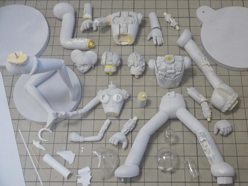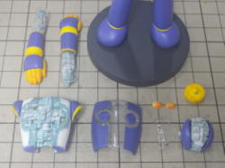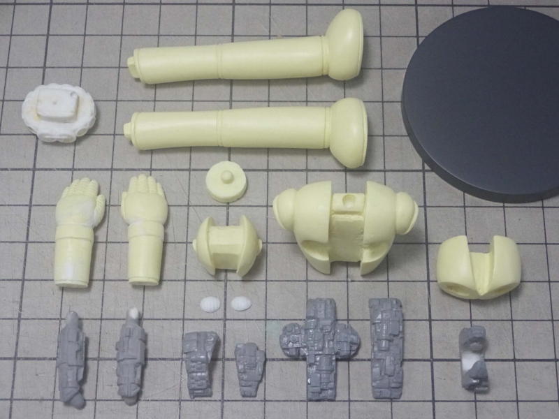 ボディパーツは白サフに黄色を混ぜたサフを、メカパーツはグレーサフを吹いて表面を整えてます。 レジンパーツが台座を入れて15パーツ。透明パーツが7パーツ。全22パーツです。 |