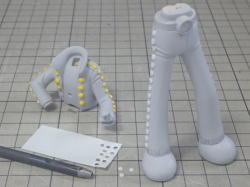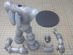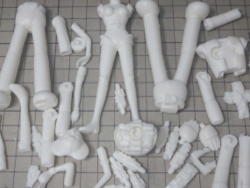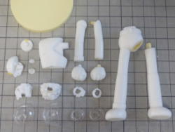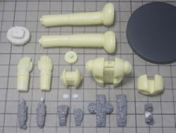 現在、8パーツ。 右端は上腕用の筒状のパーツ。なかなかきれいに抜けないので、これも2分割になるかも。 |