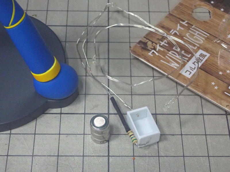 商品からチップLEDを3球と抵抗を取り出し、プラ板で作った電池ボックスと配線しました。電池はLR41を3個で、ちょうどボディ内に入ります。 |
