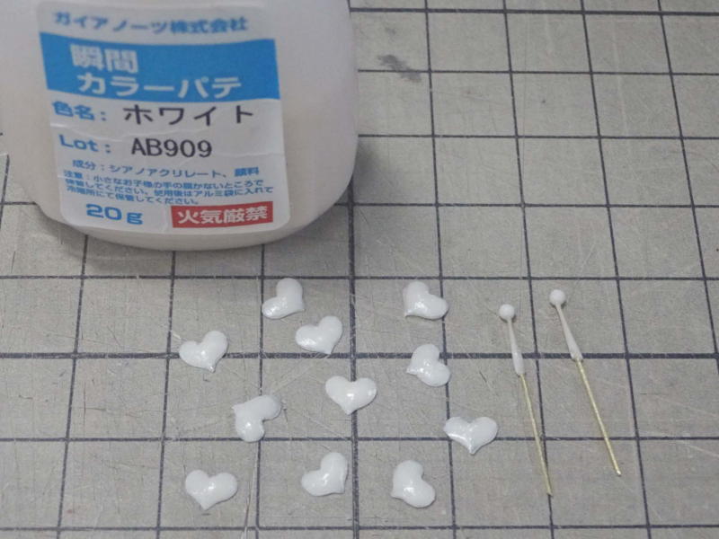 ユリの茎に葉を接着するため、油粘土の協力で位置決め中。極小サイズの点付けですから、ここは瞬間接着剤にがんばってもらいます。 |