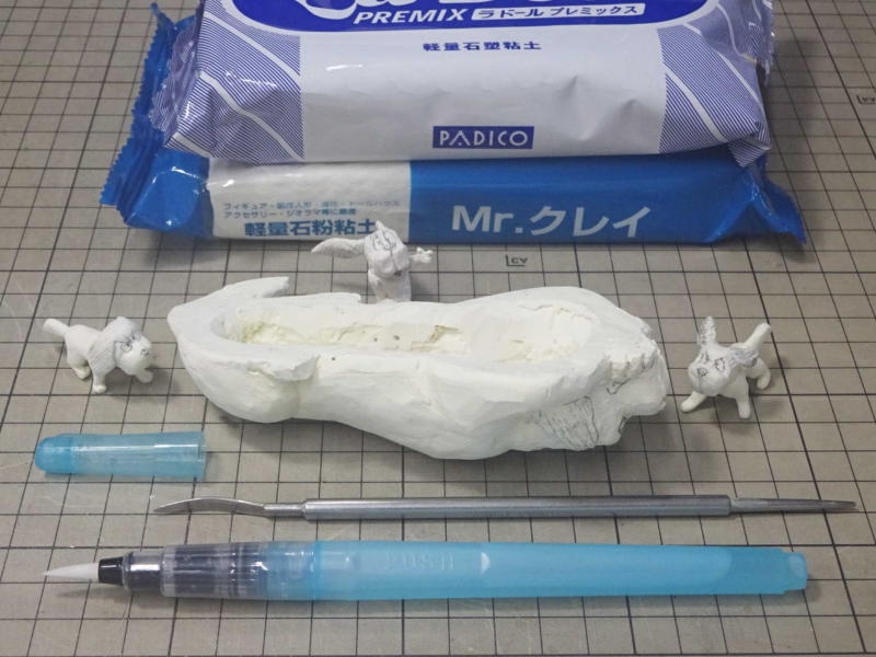 ←最近は柔らかめの粘土を使ってます。 ←表面が固まったら生乾きの内部をかき出して乾燥させてます。 ガンツ先生も中身は空洞。 ←粘土もパテの造形もこれがないと作れない。 ←粘土を盛り足すところを湿らすのは水筆が便利。 |
